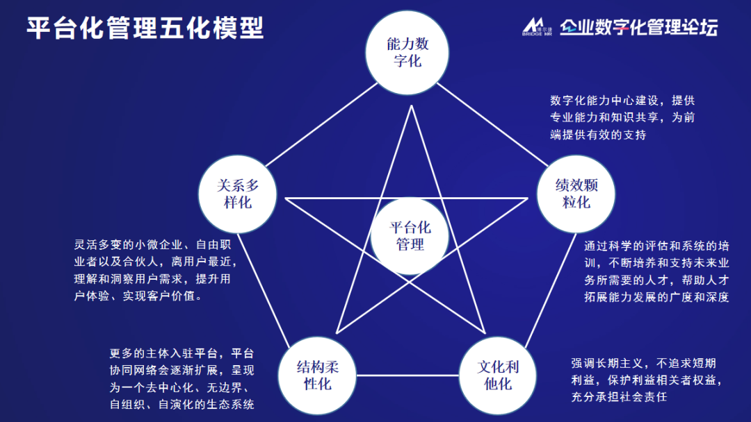 從2013年的OA,2015年ERP,到2018年開始嘗試開發(fā)人力資源系統(tǒng)直到2021年推廣使用,再到2022年數(shù)字挖掘、智能分析,以及未來的智慧平臺,智慧決策、智能投放和智能預警。博爾捷集團的平臺化轉型實踐,以著高效的數(shù)字化的平臺和智慧化的生態(tài)平臺為依托,遵循著平臺化管理五化模型不斷進行著。平臺化管理五化模型,更是其中的重點。